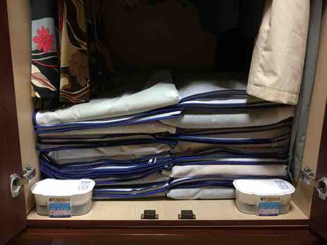 着物もコンパクトに収納できたし、湿気対策もしたのでひとまず安心していたのですが。ハタと気付きました。この洋服箪笥の上部には、父の形見の背広がたくさんぶら下がっているのですが、迂闊だったわ。背広といえば純毛、ウールじゃありませんか!!!
