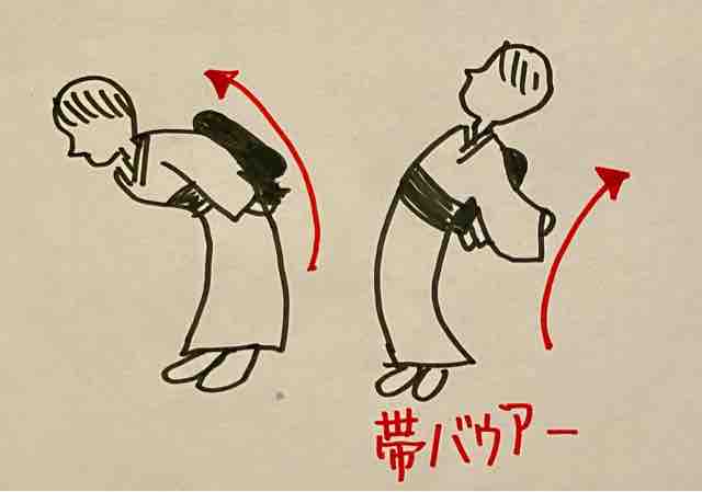 「そう!イナバウアーの姿勢で帯を背負うことを帯バウアーと言うのですよ。前屈して背中を丸めてお太鼓を背負うより、帯バウアーのほうが距離が近いから帯位置が上がるし、お太鼓柄も綺麗に出ますよ」「えーっ、マジで⁈ 帯バウアー、全然知りませんでした」