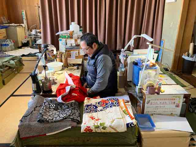 私が伺ったとき、紋慶さんの六代目が丹精込めてお手入れなさっていたのは、なんと石川県から大量に送られてきた令和6年能登半島地震で被災されたお着物たち!