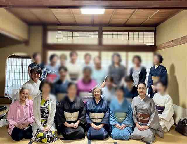 集合写真です。途中で、着物にまつわる井戸端会議みたいなわきあいあいとした雰囲気になりました。いつもながら着物の話は尽きなくて、いつまでも聞いていたい、語り合いたいと思います。