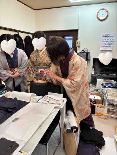 格の高いお着物なので、縫い紋をつけてらっしゃいます。おまけに同じ生地で長羽織もお仕立て中だそうです。いいな、いいな。素敵すぎて、私たち3人ともうっとり。目の保養させていただきました。