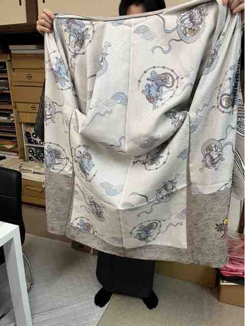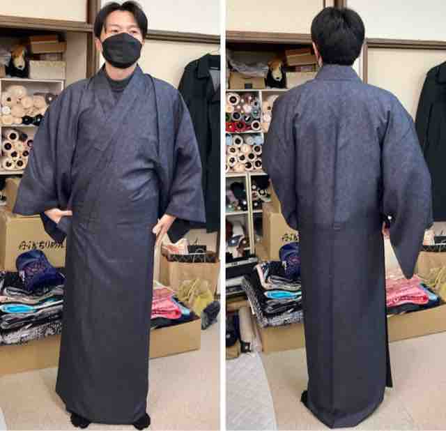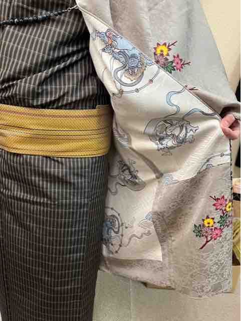 そしてもう一枚は、紋屋井関さんの地紋も素晴らしい、しなやかな女性用の訪問着を、解いて洗い張りして「たき染め」して、週末着物男子さん用に一級和裁士さんが仕立て直されたお着物です。