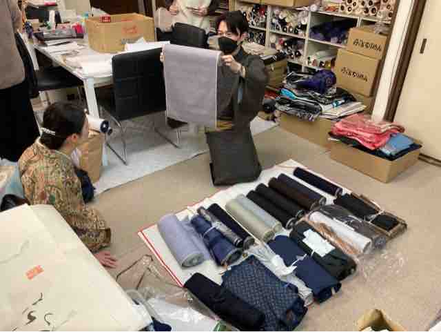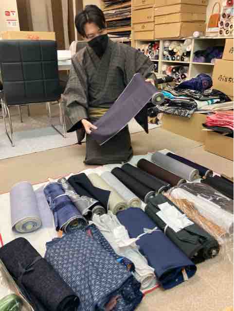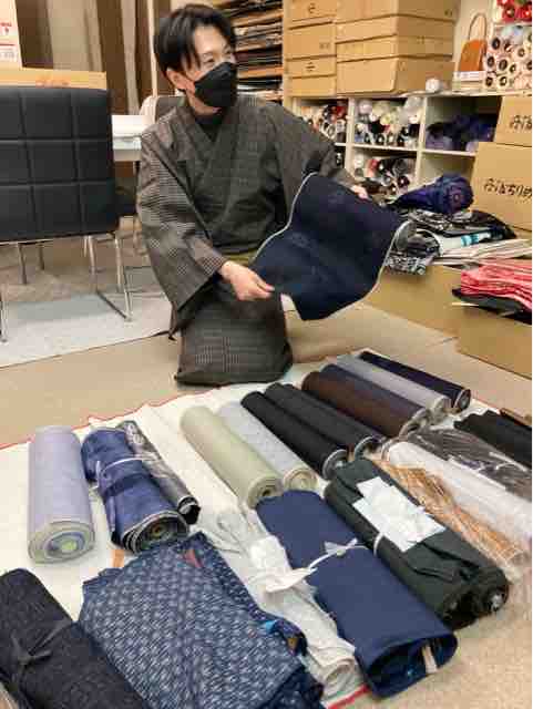 呉服屋の若旦那がお客さんに反物を説明しているように見えますが、違います(笑)。すべて週末着物男子さんがこれから文字商店さんで、長着や羽織にお仕立てする予定の反物です。一人の一級和裁士さんに順にお願いしてらっしゃるので、ただいま「お仕立て渋滞中」だそうです。