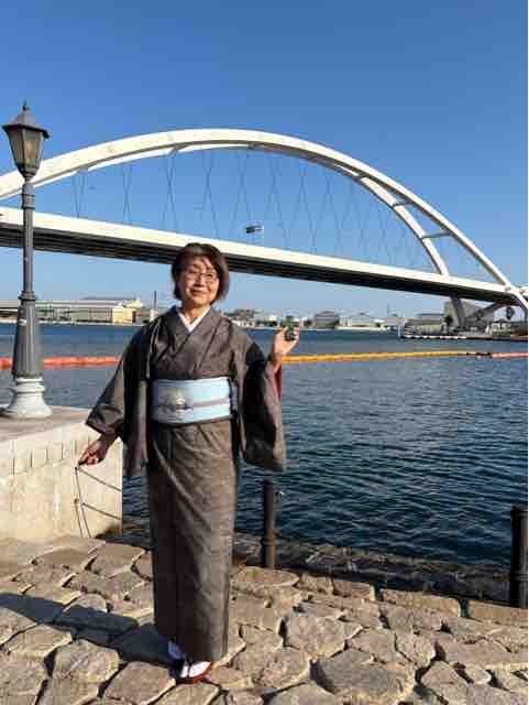 そして着物は本場大島紬の泥染め、カタス9マルキです。教会の着物仲間の姉妹が譲ってくださいました。サイズも誂えたようにピッタリ、雲取柄の模様も可愛く、神様からの恵みですね。